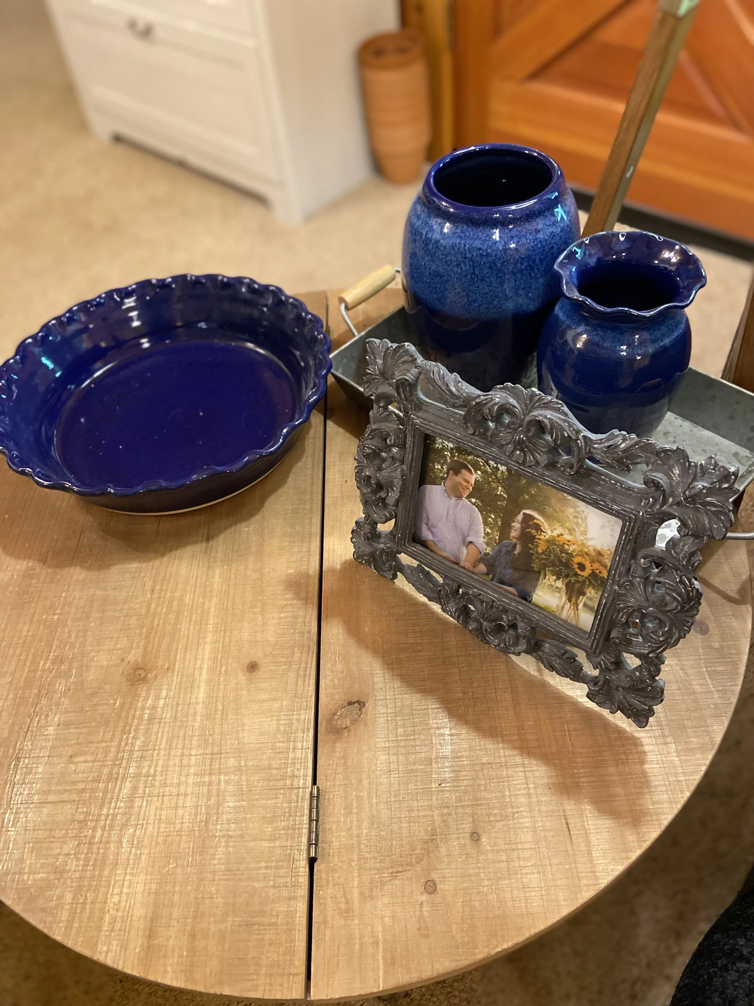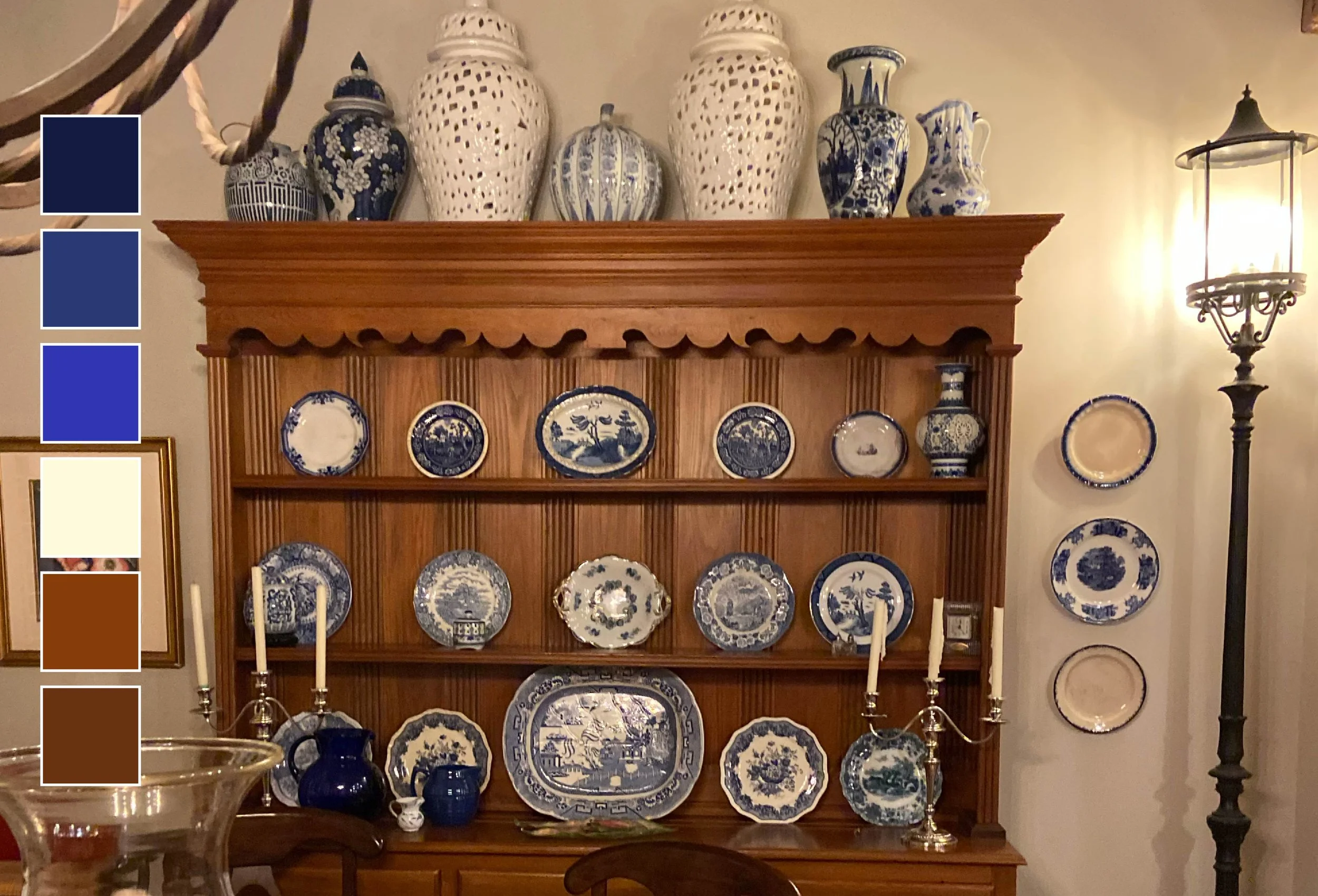 When I was traveling with Jared for a garden talk, we went to a gala one evening. The host had a china cabinet filled with blue and white ceramics. I created a color story with blues and a cream color for the dishes and vases, and wood tones for the cabinet itself.