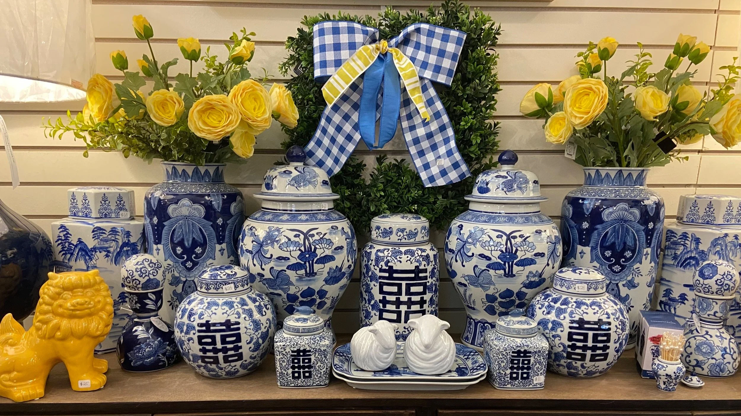 Whenever I see something I like when I am out and about, I take a photo for design inspiration. I loved this cabinet display full of blue and white ceramics that I saw at a boutique. The yellow flowers paired well with the chinoiserie ceramics too.