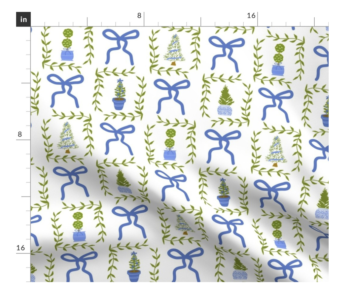 The color story for Chinoiserie Christmas Trees includes hues of blue, greens, and white.