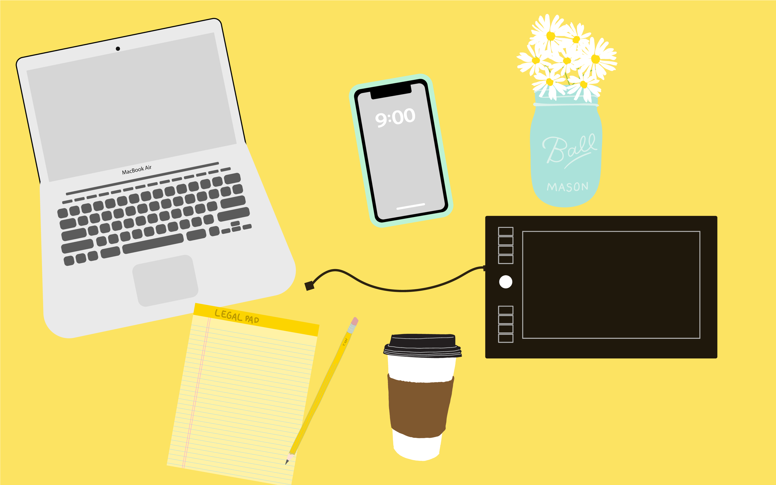 Creative Time. Having scheduled periods to create allows freedom. It gives me an open window of allotted time where I can crank out new ideas and sketch new designs. This is a newer habit I want to practice more. Last Sunday, I needed to get some client work done. I also wanted time to get a few new designs sketched out. Since it was a Sunday, I wanted a day to rest and relax. So I walked a short distance (half a mile) and then set up my computer on my porch with my Wacom tablet to enjoy the day. I just sketched away once I was done with the imperative tasks. I find batching designs is helpful, since I often edit illustrations and complete patterns at a later time. I can lose myself in time when I am wrapped up in new work. This is a nice way for me to relax. I schedule the weekdays for working more on the business side of things, like emailing my portfolio, completing blog posts, or updating my website. This leaves time on the weekends for more creative outlets.