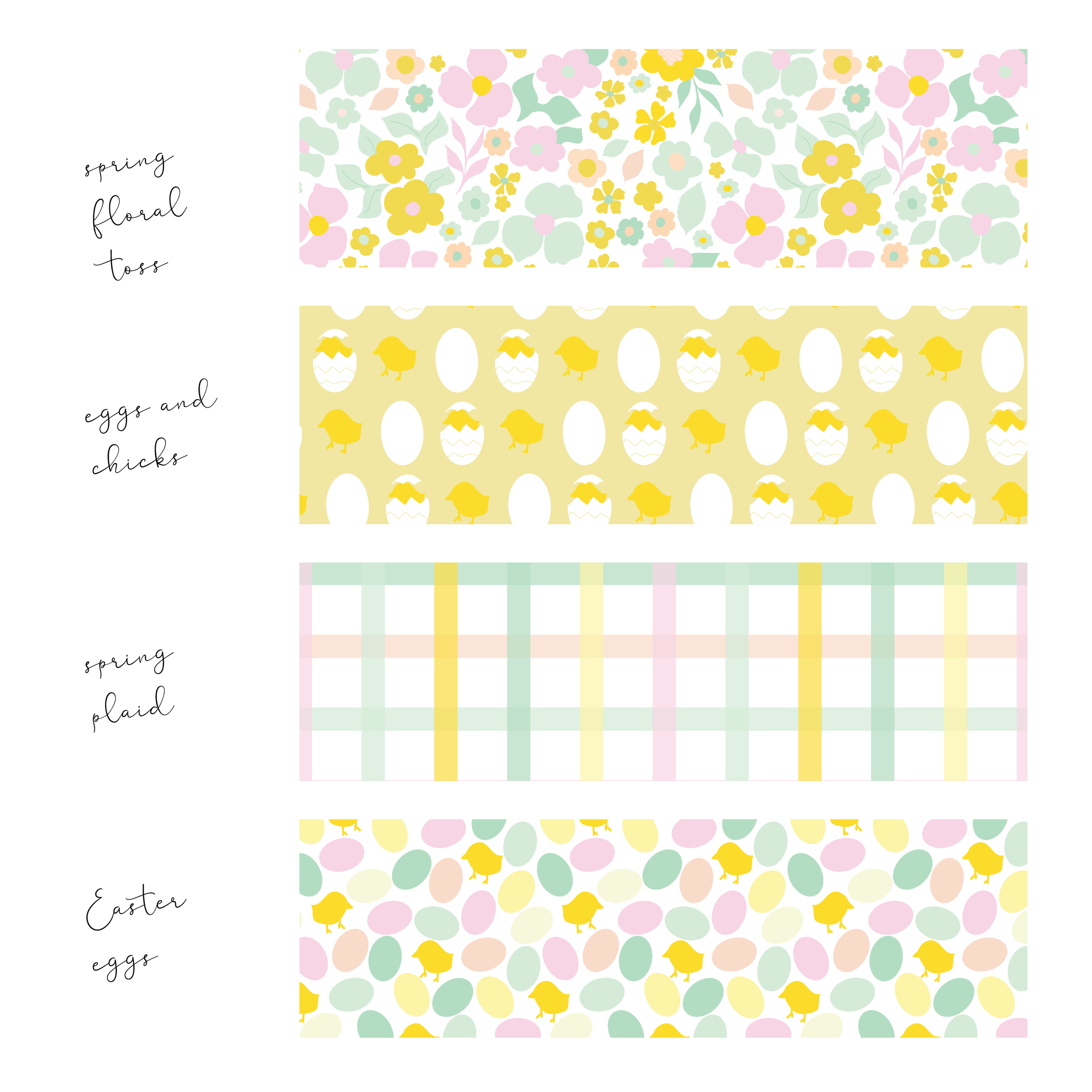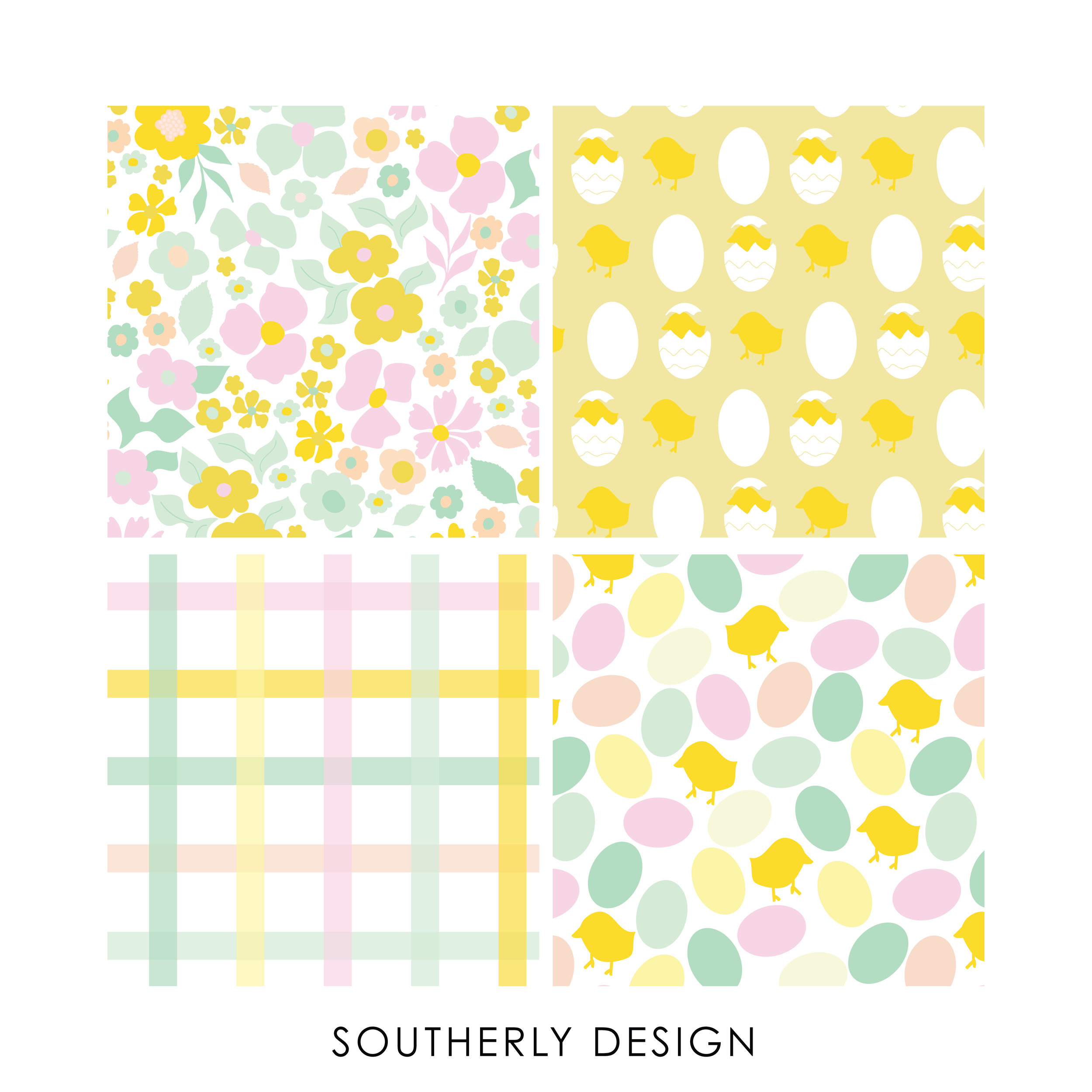This collection has 4 patterns like my other mini collections. I’ve used the floral toss print in different seasonal collections, including my St. Patrick’s Day Pattern Collection with a color palette that matches the season. The Easter Pattern Collection features the prints: spring floral toss, eggs and chicks, spring plaid, and Easter eggs.
