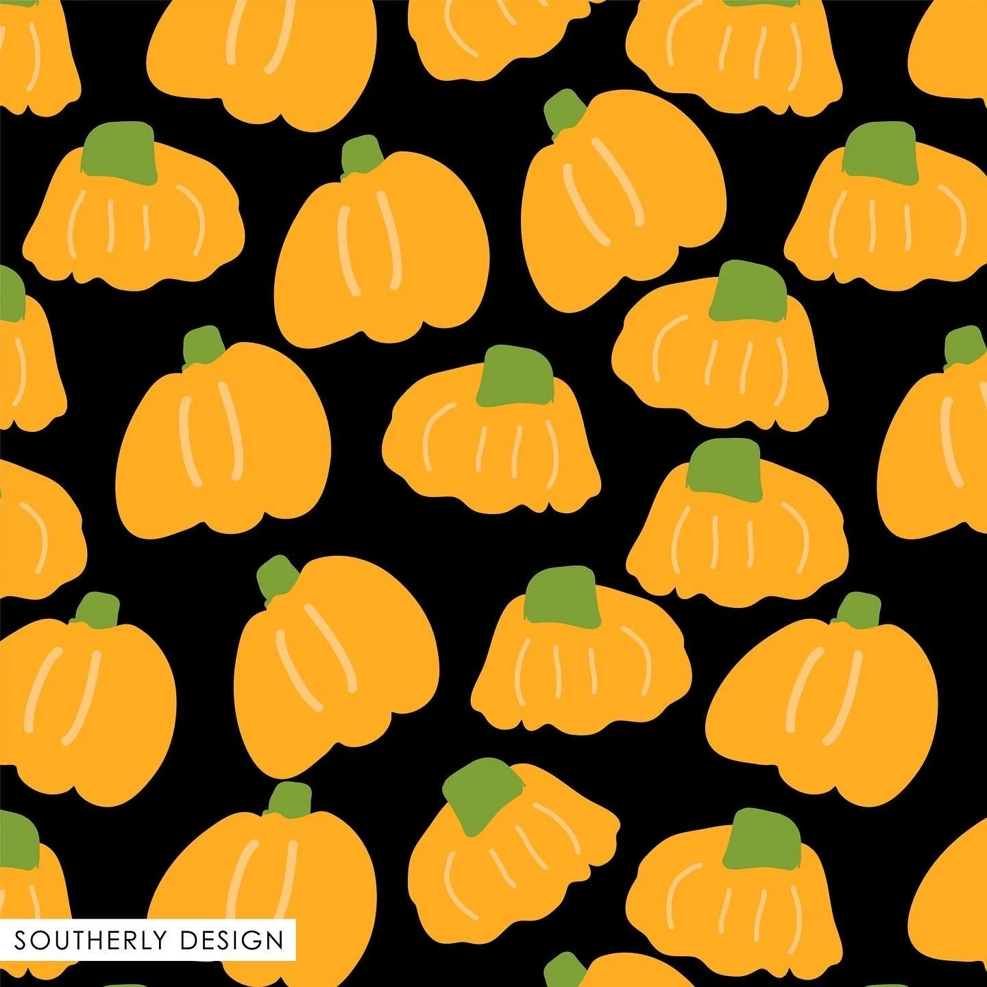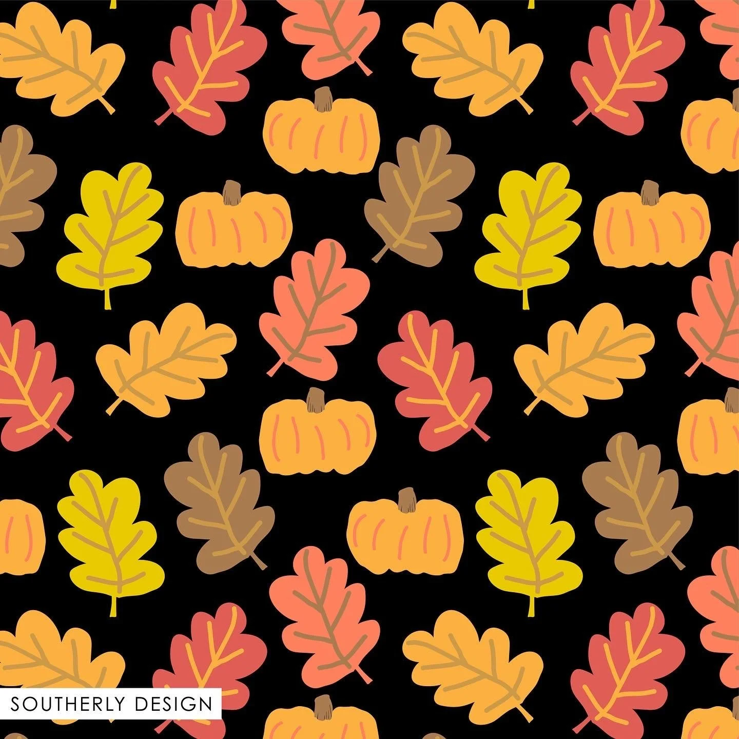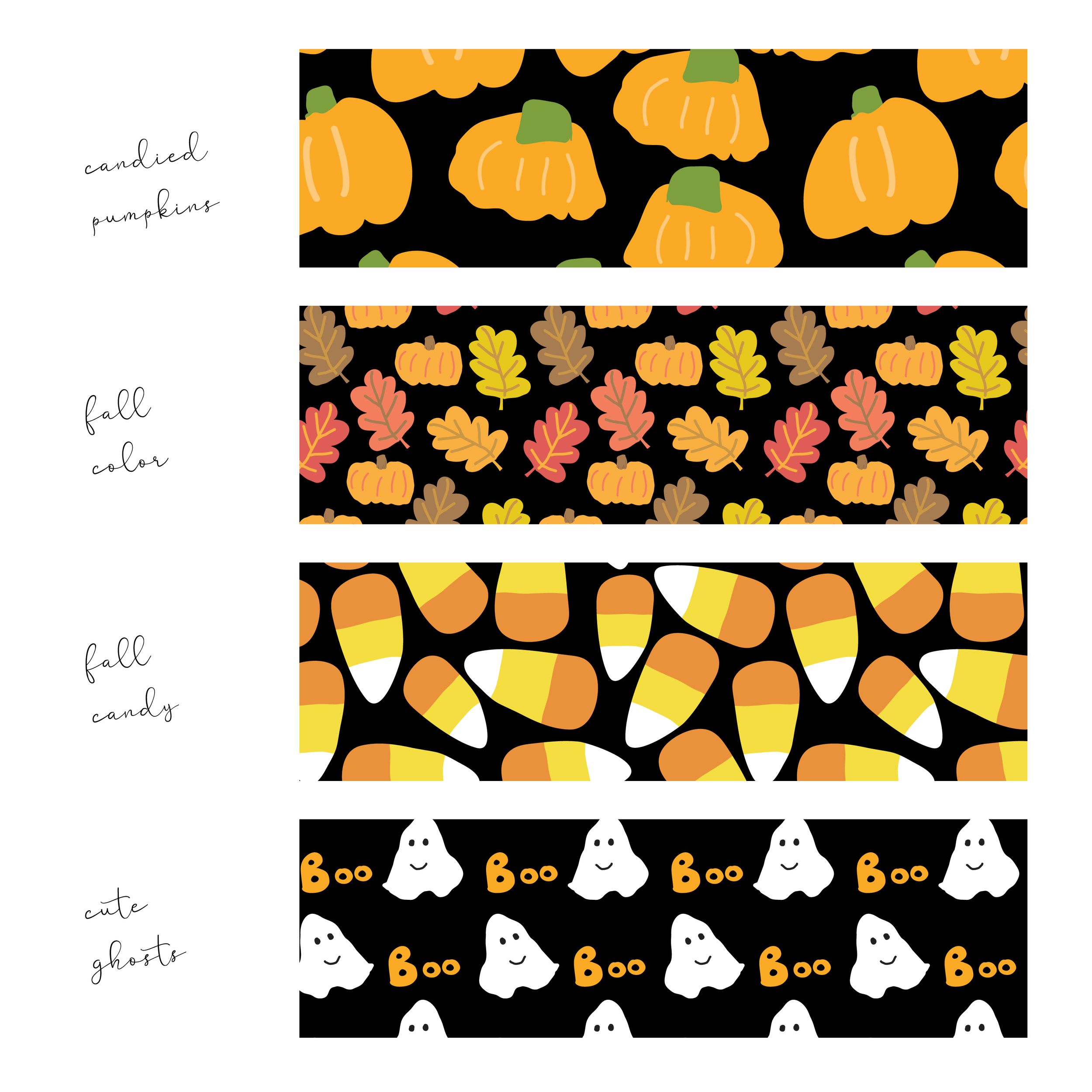 This collection has 4 patterns featuring leaves, pumpkins, fall candies, and ghosts. It is shown in a seasonal, autumnal color palette.