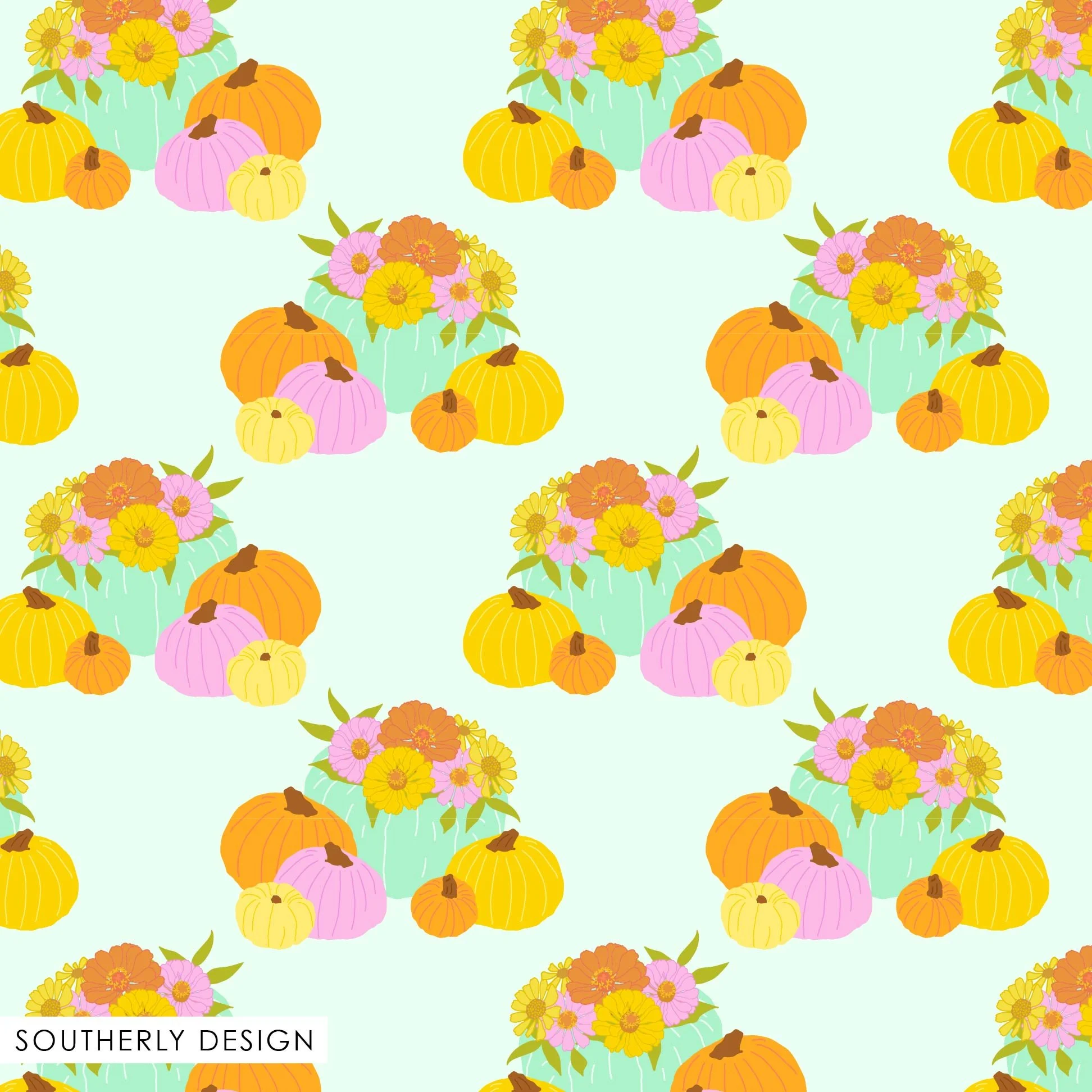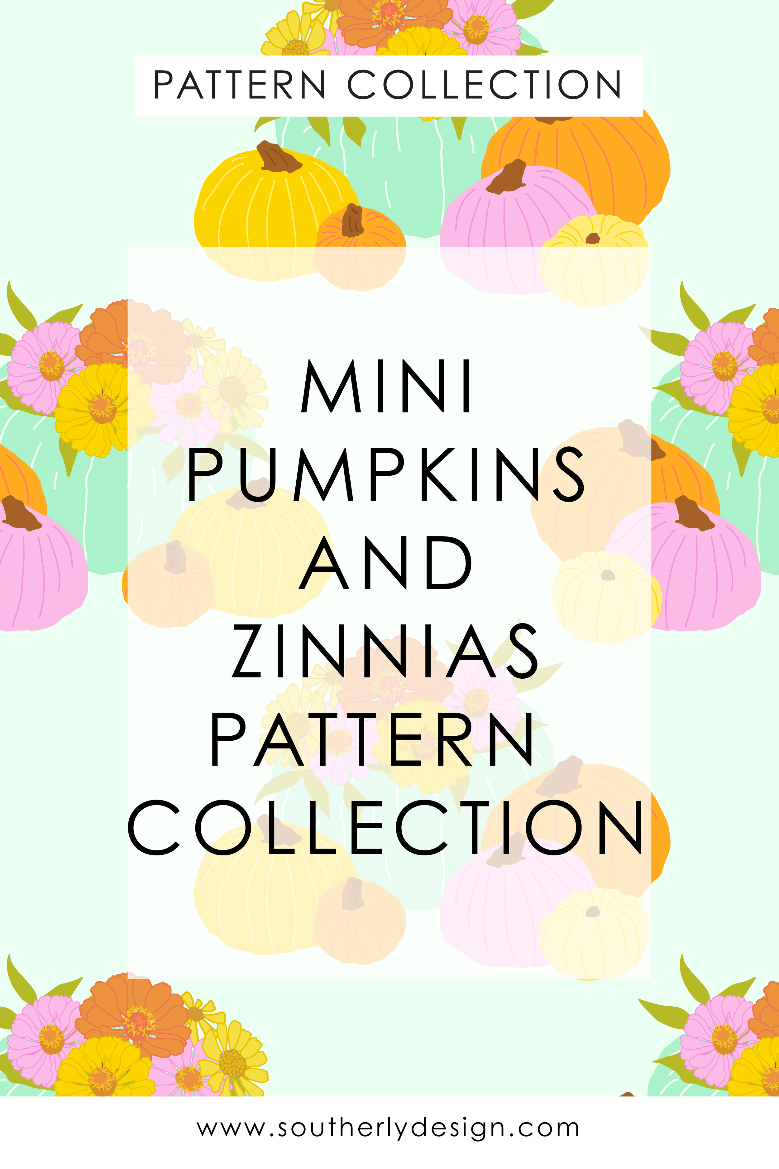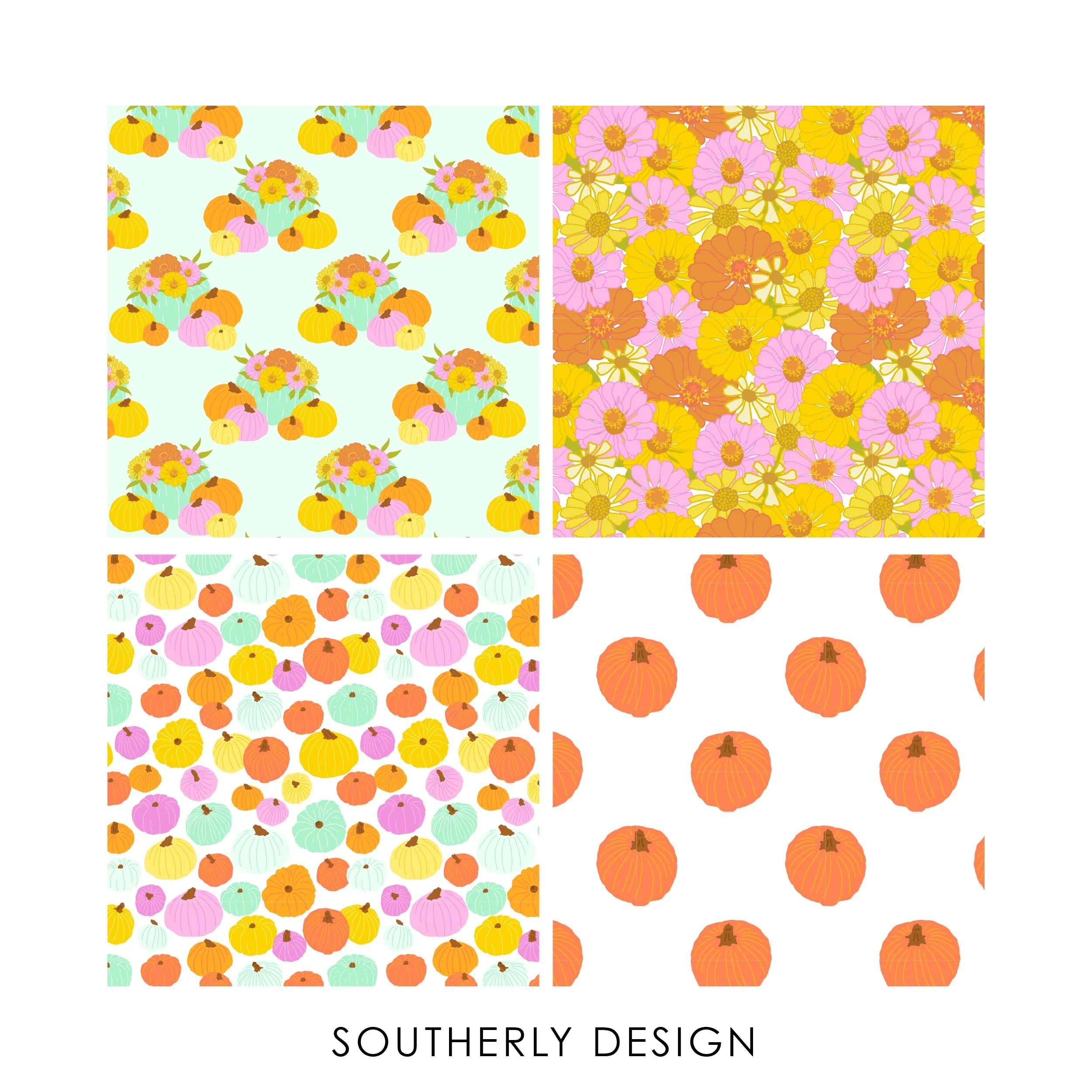 Another mini pattern collection for fall featuring pumpkins and zinnias in a bright color palette! I normally design in 9 patterns for a full collection. Fall is my favorite season! I love everything pumpkin and enjoy making arrangements for our porch with flowers and pumpkins. I like doing the mini collections to see how a seasonal pattern collection can come together, like my mini St. Patrick’s Day Pattern Collection, my mini Easter Pattern Collection and my mini Halloween Pattern Collection. I will sometimes make a full pattern collection with 9 patterns total. This gives art directors and art buyers a glance at my seasonal work for holidays.