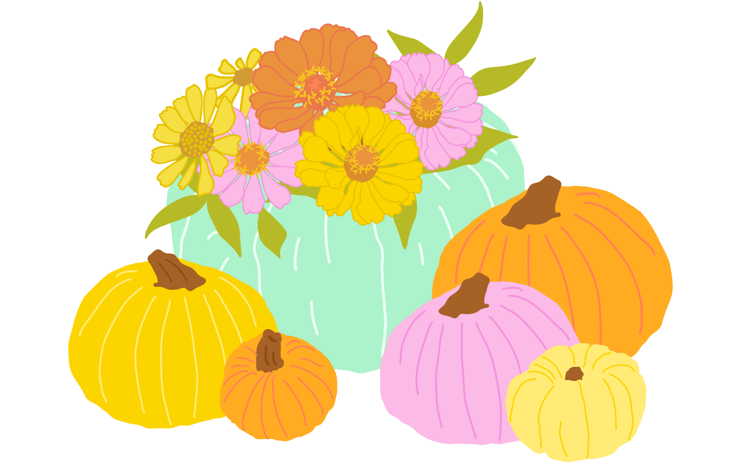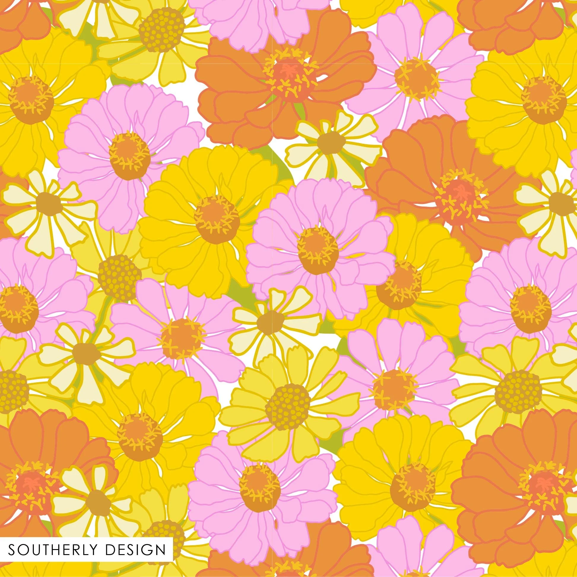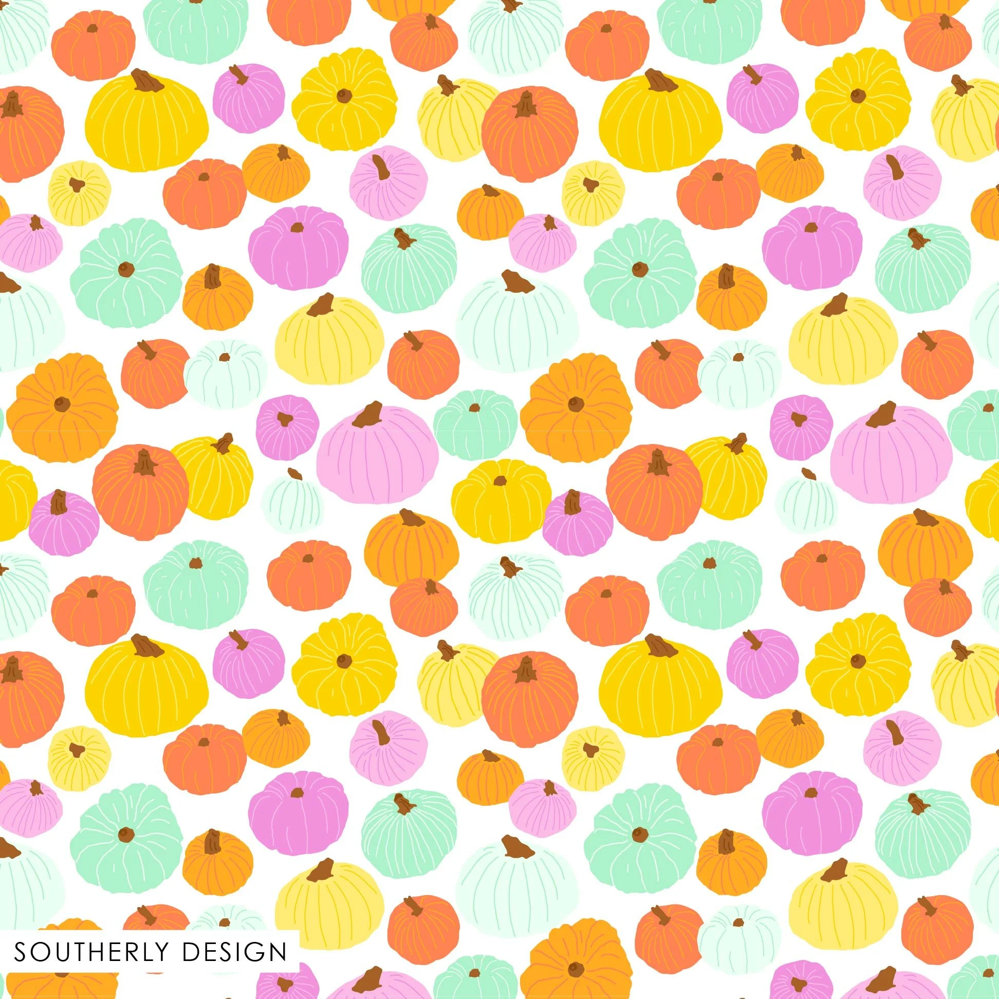 Another mini pattern collection for fall featuring pumpkins and zinnias in a bright color palette! I normally design in 9 patterns for a full collection. Fall is my favorite season! I love everything pumpkin and enjoy making arrangements for our porch with flowers and pumpkins. I like doing the mini collections to see how a seasonal pattern collection can come together, like my mini St. Patrick’s Day Pattern Collection, my mini Easter Pattern Collection and my mini Halloween Pattern Collection. I will sometimes make a full pattern collection with 9 patterns total. This gives art directors and art buyers a glance at my seasonal work for holidays.