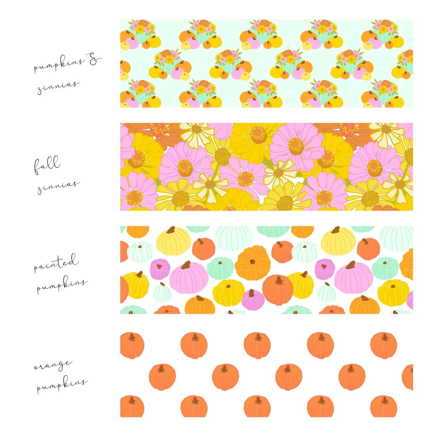 This collection has 4 patterns like my other mini collections. The Mini Pumpkins and Zinnias Pattern Collection features the prints: pumpkins & zinnias, fall zinnnias, painted pumpkins, and orange pumpkins.