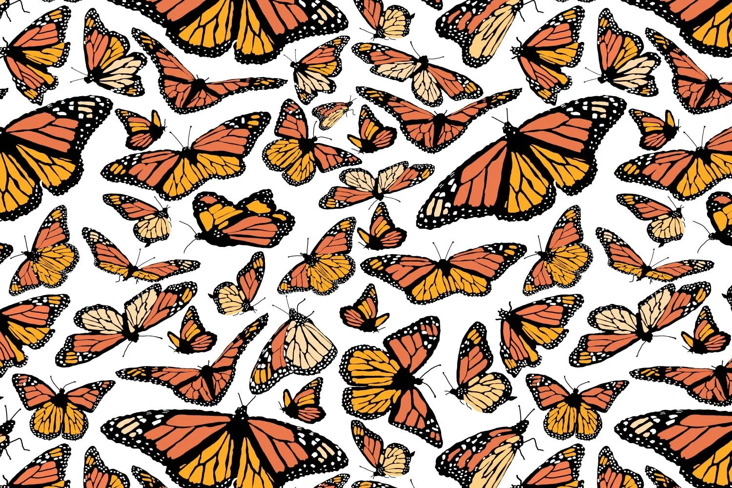 The Monarchs in Flight pattern is a toss pattern of monarch butterfly motifs, to capture their movement from flower to flower.